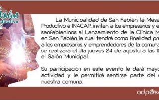 Fecha: Jueves 24 de Agosto de 2017 Horario: 15:00 horas Lugar: Salón Municipal de San Fabián La Municipalidad de San Fabián, la Mesa de Fomento Productivo e INACAP, invitan a los empresarios y emprendedores sanfabianinos al Lanzamiento de la