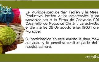 La Municipalidad de San Fabián y la Mesa de Fomento Productivo, invitan a los empresarios y emprendedores sanfabianinos a Firma de Convenio CDN «Centro de Desarrollo de Negocios Chillán».